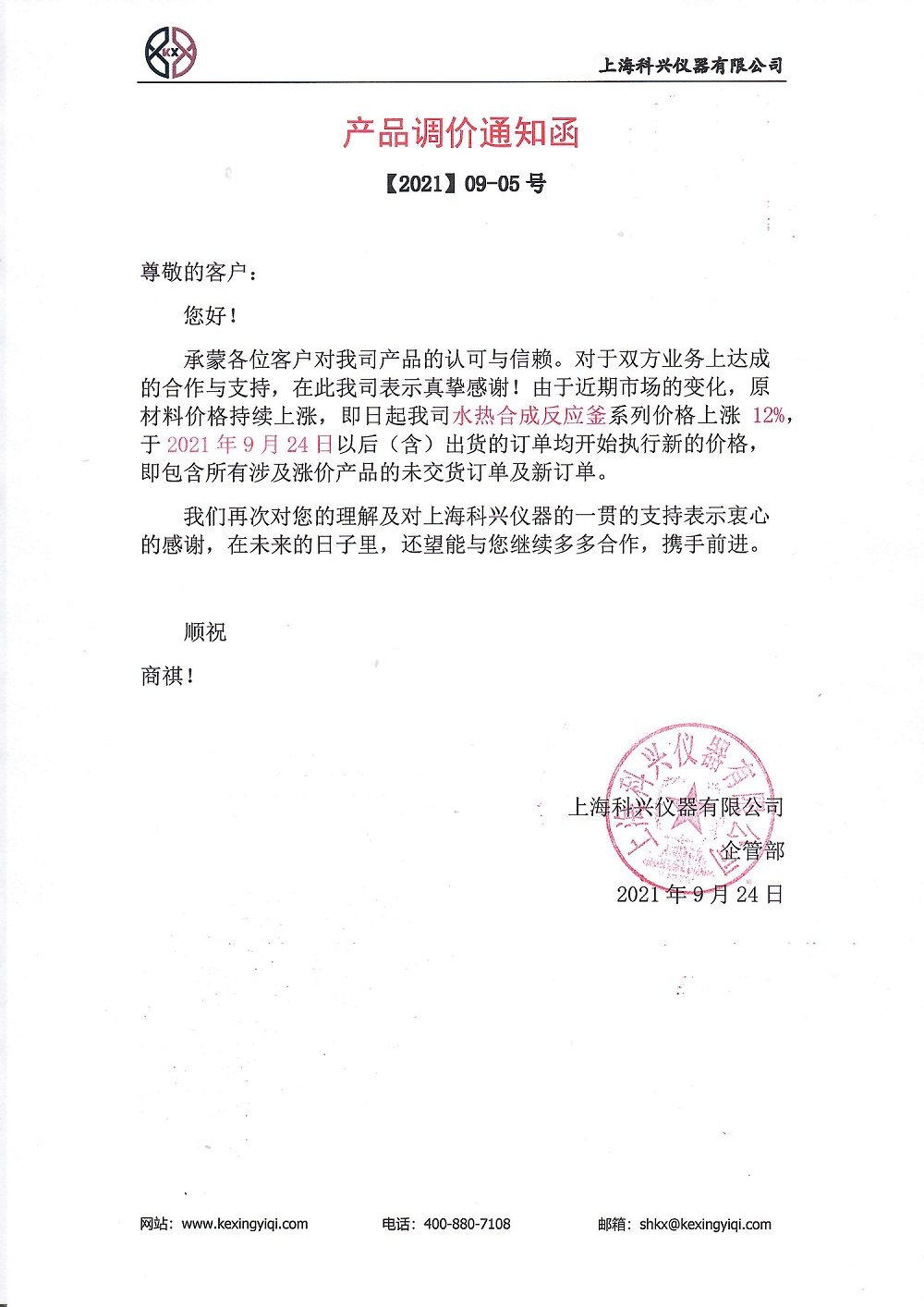 承蒙各位客戶對我司產(chǎn)品的認(rèn)可與信賴。對于雙方業(yè)務(wù)上達(dá)成的合作與支持,在此我司表示真摯感謝!由于近期市場的變化,原材料價格持續(xù)上漲,即日起我司水熱合成反應(yīng)釜系列價格上漲 12%,于 2021 年 9 月 24 日以后(含)出貨的訂單均開始執(zhí)行新的價格,既包含所有涉及漲價產(chǎn)品的未交貨訂單及新訂單。