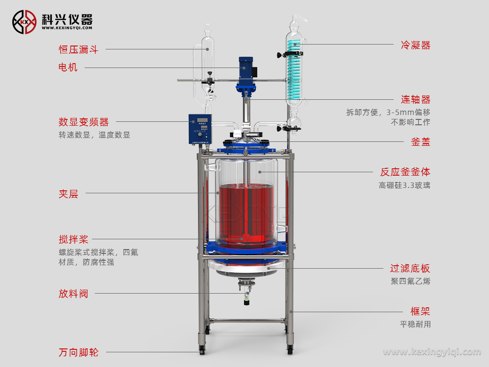 主要用于制藥、化工、實驗室等機構的有機合成實驗室用中式設備,用于有機物合成實驗中,是生化制藥中的主要設備之一。釜體為雙層玻璃燒結而成,雙層之間可通過冷卻液和加熱液。釜底過濾篩板的設計,讓設備能承受100KG反應液的壓力。過濾裝置采用法蘭和四氟材料制成與釜體相連,過濾器為玻璃砂芯,方便拆卸清洗更換。