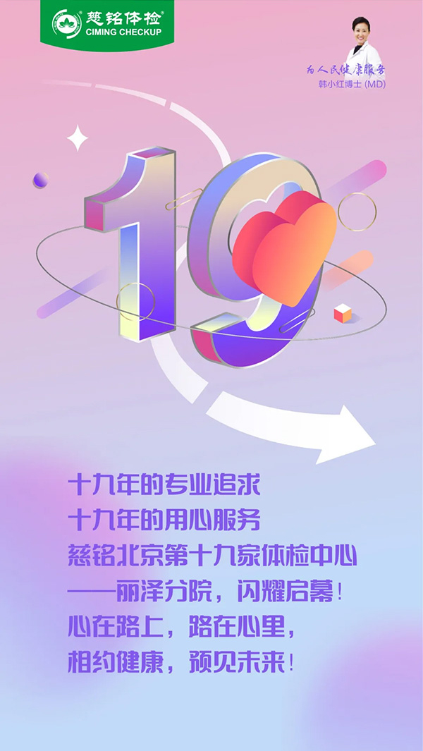 堅守品質,初心依舊 北京慈銘體檢麗澤分院已閃耀啟幕,滿足麗澤商圈及首都西南地區廣大客戶多元化、多層次的健康需求。作為慈銘【深檢分院】,麗澤分院將為商區周邊商務精英、白領等人群提供全面的深度體檢、私人醫生、定制...